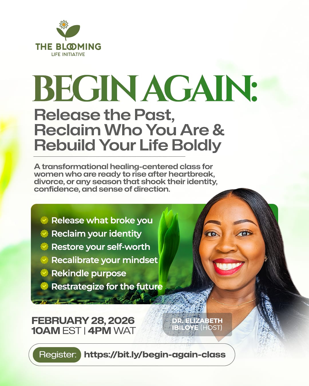 The Blooming Life Initiative is an empowerment and transformation movement dedicated to helping wounded or divorced women rise above pain, heal deeply, reclaim their identity and step into a vibrant life of purpose and wholeness.